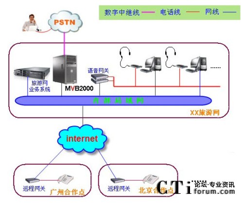 在技術上,旅游網(wǎng)IP呼叫中心解決方案的語音業(yè)務通過電信運營商的模擬電話線路(或者模擬中繼線路)接入,數(shù)據(jù)業(yè)務都通過互聯(lián)網(wǎng)使用TCP/IP協(xié)議傳送,解決了呼叫中心中大量數(shù)據(jù)傳送的需求,請看下面的網(wǎng)絡組織結構圖: