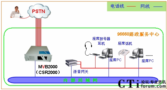局域網(wǎng)+呼叫中心服務(wù)器(含MVB2000交換系統(tǒng)、CSR2000業(yè)務(wù)系統(tǒng)與模擬語音接口卡)+語音網(wǎng)關(guān)(S口)+座席話機(jī)(或者撥號(hào)器耳機(jī))+座席PC;