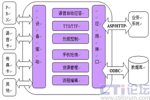 CTI服務器是整個系統(tǒng)的核心,通過內(nèi)置電話語音/傳真卡,接入PSTN電話網(wǎng)。該服務器可作為一個相對獨立的系統(tǒng)單獨運行,也可以通過企業(yè)局域網(wǎng)與企業(yè)的業(yè)務系統(tǒng)連接。
