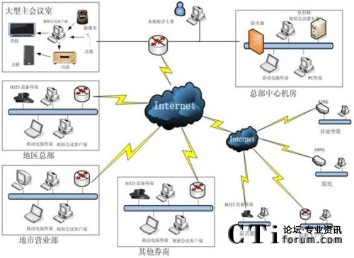 新時(shí)代證券公司下屬多個分支機(jī)構(gòu)。目前公司總部在北京,視頻會議服務(wù)器設(shè)置在上海原遠(yuǎn)東證券機(jī)房,通過電信的10M帶寬接入互聯(lián)網(wǎng),并配備有廣域網(wǎng)靜態(tài)IP地址。各地分支機(jī)構(gòu)和營業(yè)部通過電信ADSL接入和光纖接入等方式接入互聯(lián)網(wǎng)。這些點(diǎn)能夠?qū)崿F(xiàn)網(wǎng)絡(luò)視頻會議通訊,進(jìn)行音頻、視頻和數(shù)據(jù)的多方溝通。
