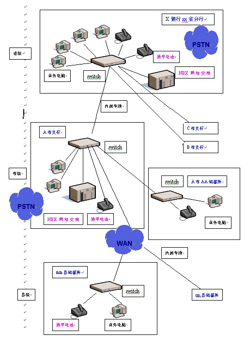 在銀行的省、市級分行分別部署一臺NBX網(wǎng)絡(luò)交換機(jī)——只需通過接入銀行系統(tǒng)內(nèi)部局域網(wǎng),經(jīng)過簡單的配置即可使用。然后根據(jù)需要,在市內(nèi)各個儲蓄所、各縣級儲蓄所配置相應(yīng)數(shù)量的數(shù)字話機(jī),那么在全省內(nèi)各個縣市區(qū)的各個營業(yè)網(wǎng)點(diǎn)之間,上下級之間就都可以使用數(shù)字電話機(jī)通過數(shù)據(jù)網(wǎng)免費(fèi)撥打語音電話。