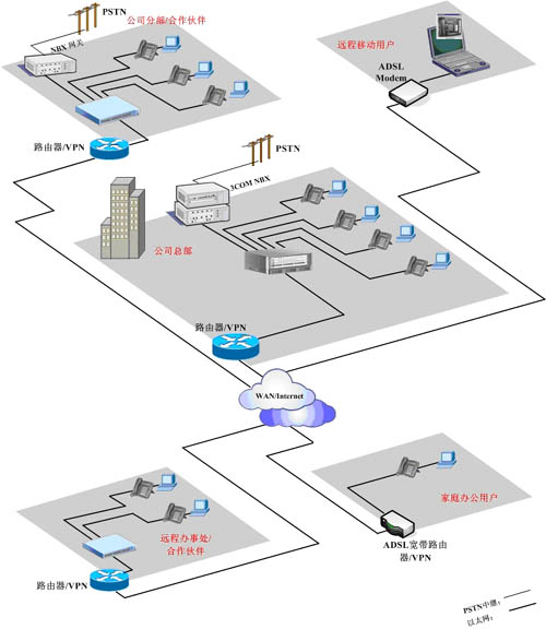 采用3COM NBX系統(tǒng)我們可以為用戶提供移動的、靈活的辦公電話系統(tǒng),本系統(tǒng)的遠程Internet接入采用ADSL或專線方式。