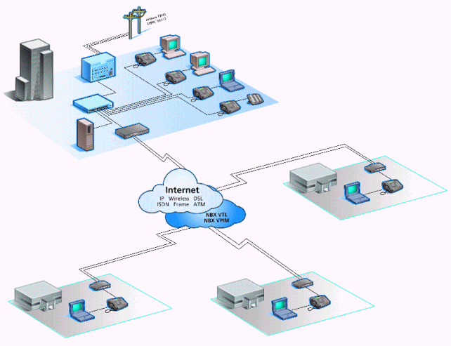 注:企業(yè)架設(shè)NBX通訊系統(tǒng)后,實(shí)現(xiàn)SOHO辦公只需要接入Internet架設(shè)VPN網(wǎng)絡(luò),員工可通過小區(qū)寬帶接入或ADSL接入即可實(shí)現(xiàn)內(nèi)部通訊就像在企業(yè)內(nèi)部辦公一樣通訊不受任何限制。客戶來電時只需撥打分機(jī)號,無論員工在任何地點(diǎn)都可接聽來電。企業(yè)可以通過TCA(通訊助理)軟件給員工發(fā)送公告、組建電話會議、短信通知等應(yīng)用。