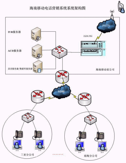 此次為電話營(yíng)銷系統(tǒng)一期工程,在省公司部署一套NBX V5000系統(tǒng)及相應(yīng)的CTI服務(wù)器,通過2條E1接入PSTN,在18個(gè)地市直接部署50個(gè)IP電話終端及坐席端軟件,語音走移動(dòng)已有的MDCN網(wǎng)絡(luò),一個(gè)集中受理分布處理的呼叫中心系統(tǒng)就建設(shè)起來啦,本次工程從設(shè)備到貨、系統(tǒng)上線試運(yùn)行,僅僅用了1個(gè)星期,我們海南移動(dòng)公司的項(xiàng)目經(jīng)理都驚訝的說"太快啦啦,要是使用傳統(tǒng)的排隊(duì)機(jī)部署一個(gè)分布全省的類似系統(tǒng),少說工期也得幾個(gè)月"。經(jīng)過1個(gè)月的試運(yùn)行,系統(tǒng)運(yùn)行穩(wěn)定,各項(xiàng)系統(tǒng)指標(biāo)滿足合同要求,在11月份系統(tǒng)順利通過初驗(yàn)。