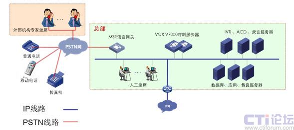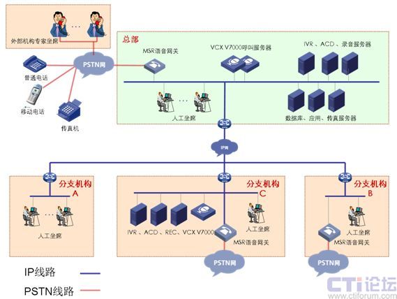 分支機(jī)構(gòu)B:網(wǎng)絡(luò)通過(guò)VPN技術(shù)與總部實(shí)現(xiàn)數(shù)據(jù)語(yǔ)音傳輸,部署MSR語(yǔ)音網(wǎng)關(guān)與當(dāng)?shù)豍STN網(wǎng)連接,IP坐席。兩地申請(qǐng)相同的客服號(hào)碼,兩地內(nèi)撥打客服號(hào)碼,客戶(hù)無(wú)長(zhǎng)途話(huà)費(fèi)產(chǎn)生。適用與總部與分支處在不同省市。