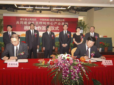 簽約儀式在密云瑞海姆田園度假村舉行,雙方就共建北京呼叫中心產(chǎn)業(yè)基地項(xiàng)目簽訂了《共同建設(shè)北京呼叫中心產(chǎn)業(yè)基地戰(zhàn)略合作協(xié)議》,北京市副市長茍仲文同志、中國網(wǎng)通(集團(tuán))有限公司董事長兼總裁左迅生、副總裁姜正新,北京市發(fā)展改革委、規(guī)劃委等市政府相關(guān)部門、密云縣人民政府、中國網(wǎng)通(集團(tuán))有限公司以及多家新聞媒體共計(jì)100余人參加了儀式。