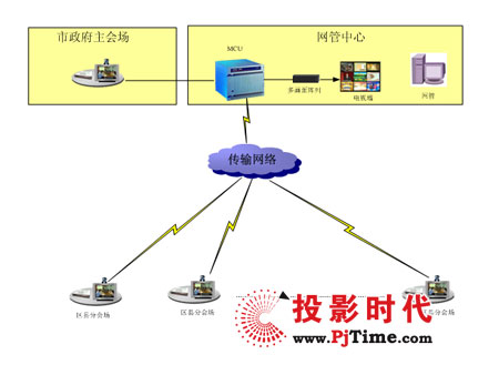 傳輸網(wǎng)絡(luò)采用4M專線,整個系統(tǒng)由控制中心、市政府主會場和18個區(qū)縣分會場組成,在控制中心配置MCU、網(wǎng)管和電視墻多畫面顯示單元,通過網(wǎng)管對系統(tǒng)實行設(shè)備的統(tǒng)一管理和會議資源的統(tǒng)一調(diào)度,控制中心配置18路電視墻集中顯示單元,通過電視墻,可實時監(jiān)看18個區(qū)縣分會場情況。在市政府主會場和18個區(qū)縣分會場,各會場配置1套高清晰視頻會議終端,各會場終端4M專線接入控制中心,實現(xiàn)全市電子政府的視頻會議系統(tǒng)。系統(tǒng)建設(shè)完成后,可實現(xiàn)導演控制、主席控制、點名發(fā)言、會場輪巡、攝像機遠控、電視墻、多畫面、多方混音等視頻會議系統(tǒng)功能。