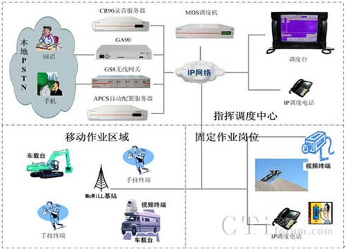 MDS系統(tǒng)可以應(yīng)用于各種作業(yè)現(xiàn)場的指揮調(diào)度, MDS系統(tǒng)不但支持系統(tǒng)基本的語音通信,調(diào)度中心可以通過視頻、數(shù)據(jù)、文本消息等綜合的多媒體方式與作業(yè)人員進(jìn)行通信交互,滿足各種復(fù)雜環(huán)境下的指揮調(diào)度需求。系統(tǒng)可以通過GS8無線網(wǎng)關(guān)、GA90 E1/T1網(wǎng)關(guān)等設(shè)備實(shí)現(xiàn)與PSTN網(wǎng)絡(luò)的互聯(lián),滿足與手機(jī)和固話網(wǎng)絡(luò)用戶接入需要。豐富的終端類型可以滿足用戶對固定崗位、移動人員及車輛設(shè)備等不同環(huán)境的使用需求,根據(jù)人員崗位工作性質(zhì)可以配置IP調(diào)度話機(jī)、手持終端和車載臺等終端。