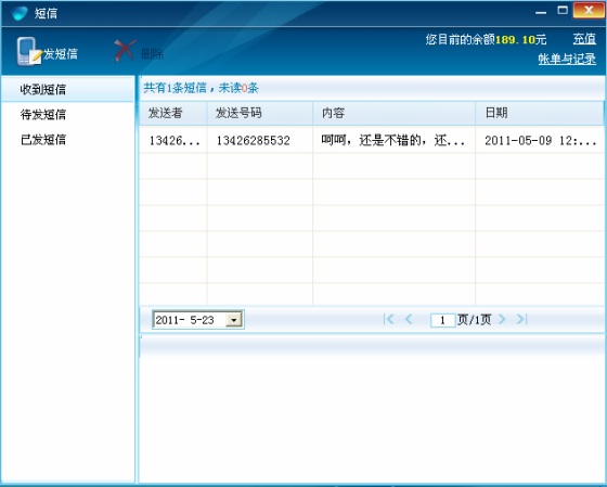 再看短信,點(diǎn)擊短信圖標(biāo),主屏自動(dòng)彈出。收到短信、待發(fā)短信、已發(fā)短信分類明確;接收日期、發(fā)送者等信息清晰,便于查詢。