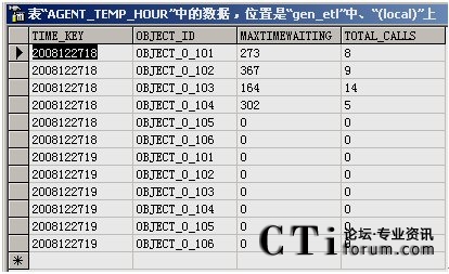從報表數(shù)據(jù)庫的相應(yīng)表中,可以看出報表需要統(tǒng)計的數(shù)據(jù)信息都以表單形式列出來。圖中的Time Key表示收集數(shù)據(jù)的具體時刻,object_id表示目標(biāo)對象在配置數(shù)據(jù)庫中存儲的ID號。MaxTimeWaiting和Total_Calls屬性對應(yīng)的是根據(jù)模板項要求統(tǒng)計的數(shù)據(jù),分別為最大等待時間和內(nèi)線呼叫總量。下面利用報表展現(xiàn)工具可以直接將該數(shù)據(jù)展示出來,生成需要的報表。