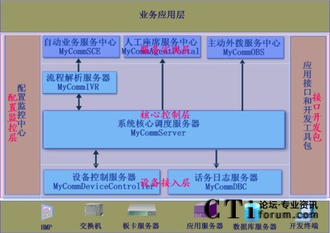 系統(tǒng)平臺層:MyComm是一個基于硬件支撐平臺之上的CTI應用開發(fā)中間件。對下屏蔽了復雜的硬件通控制;對上,簡化和提高業(yè)務應用的實際、開發(fā)和應用