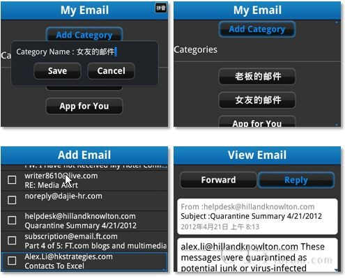 及時、安全的郵件收發(fā)是黑莓手機用戶鐘愛黑莓的重要原因之一。然而,當成千上百封郵件堆積在郵件系統(tǒng)內(nèi),疏于整理和歸類,以至于你無法找到或者挑選你想要的那封郵件中的信息時,你可能就沒那么Happy了吧?My Email應用,可以稱之為你郵件系統(tǒng)的“管家婆”,安裝了它之后,你可以將所有郵件有條理的進行分類管理:公私分明、客戶分明、項目分明、老板同事分明,想瀏覽哪類郵件一目了然。此外,對于那些及其重要的郵件,“管家婆”還可以幫你儲存在SD卡上,即使原郵件已經(jīng)被刪除,儲存的郵件也可以被找回,如此一來,有限的手機存儲空間中就不必再存儲大量無關緊要的各種郵件,騰點空間給你心水的各種音樂圖片和視頻吧。