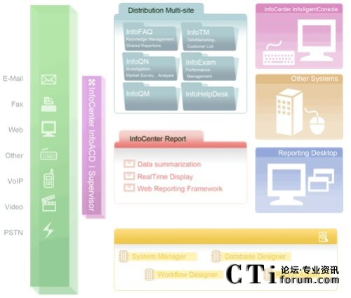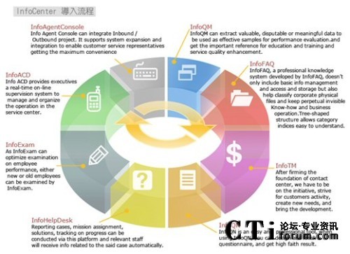 由于今日的客服中心已是多媒體的客服中心,不再只有單純的電話進(jìn)線,客戶(hù)尋求服務(wù)的管道更多樣化,InfoCenter Total Solution可以完全整合應(yīng)用程序、數(shù)據(jù)倉(cāng)儲(chǔ)系統(tǒng)、多媒體溝通互動(dòng)管道,藉由不同的系統(tǒng)達(dá)到分析與處理客戶(hù)需求,并且達(dá)到一致性的工作流程管理,提供更高質(zhì)量的服務(wù)。