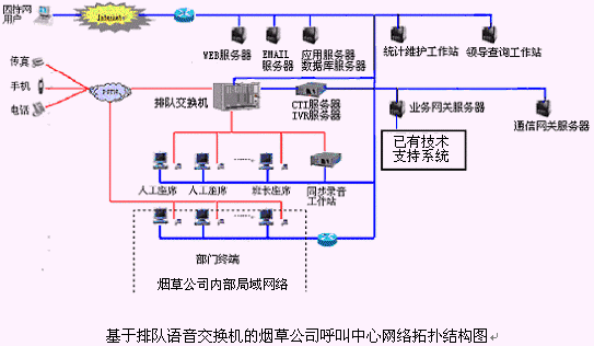 該煙草公司呼叫中心主要是由語音交換機、CTI服務(wù)器、IVR(交互式語音應(yīng)答)/IFR(交互式傳真應(yīng)答)子系統(tǒng)、人工座席子系統(tǒng)、應(yīng)用服務(wù)器、數(shù)據(jù)庫服務(wù)器、業(yè)務(wù)網(wǎng)關(guān)子系統(tǒng)、通信網(wǎng)關(guān)子系統(tǒng)等硬件設(shè)備和應(yīng)用軟件組成。