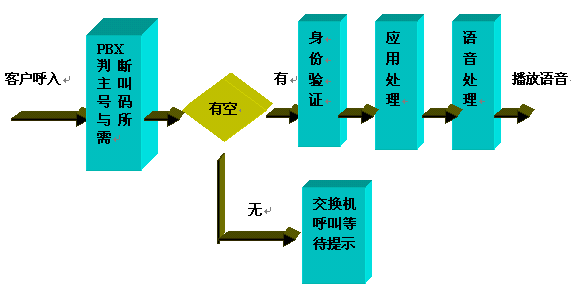 呼入一般都先通過(guò)ACD進(jìn)行排隊(duì),然后根據(jù)用戶(hù)選擇進(jìn)入子系統(tǒng),流程圖如下: