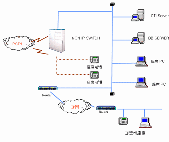 第一期工程,采用ISDN PRI信令接入方式,已上線24坐席運(yùn)行。二期工程,單框可平滑升級(jí)擴(kuò)容到348個(gè)坐席。