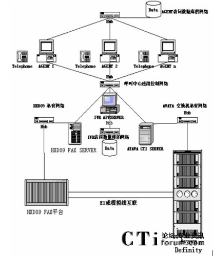 HXD09交換機通過E1上的信令完成控制話路,同時由FAX/IVR SERVER完成業(yè)務(wù)控制如放音、收號、收發(fā)傳真等。