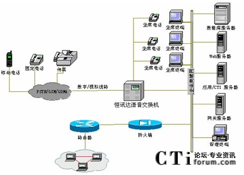 系統(tǒng)采用的硬件根據(jù)實際需求配置,如果實際接入電話容量小于30條線,系統(tǒng)與市話要采用普通模擬中繼線接入, 可選擇配置恒訊達(dá)公司HXD09的模擬板(AT0),申請的普通模擬中繼線需開通來電顯示業(yè)務(wù),如電信部門不開通項服務(wù),采用此種接入方式無法實現(xiàn)來電顯示功能;根據(jù)接入容量和話務(wù)員數(shù)量的總和計算卡的應(yīng)用數(shù)量,如實際接入電話容量大于等于30條線,則可采用E1接口數(shù)字中繼線接入,