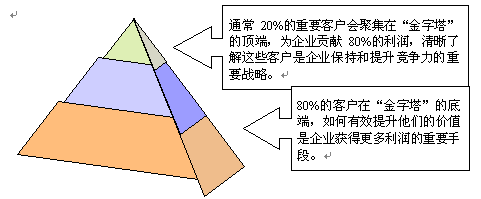 。。從抽象和通用的意義上講,多數(shù)企業(yè)的客戶價值分布是適合"二八法則"的,即20%的客戶創(chuàng)造了80%的利潤。但對每個企業(yè)而言,要洞察"究竟哪些客戶才是最有價值的客戶?""這些客戶在哪些方面的價值最大?""他們有什么共同的特征?"卻不是一件很容易的事。目前,多數(shù)企業(yè)的管理方式還停留在根據(jù)某一項或兩項單一指標(如銷售額或利潤)來作的客戶排行,無法進行多方位的綜合的客戶價值分析、管理。而要實現(xiàn)"以客戶為中心"的CRM理念,就必須建立一套全面的客戶價值評估管理系統(tǒng),并利用系統(tǒng)強大的數(shù)據(jù)分析、挖掘功能,快速地進行客戶群價值細分管理,建立起客戶價值金字塔。