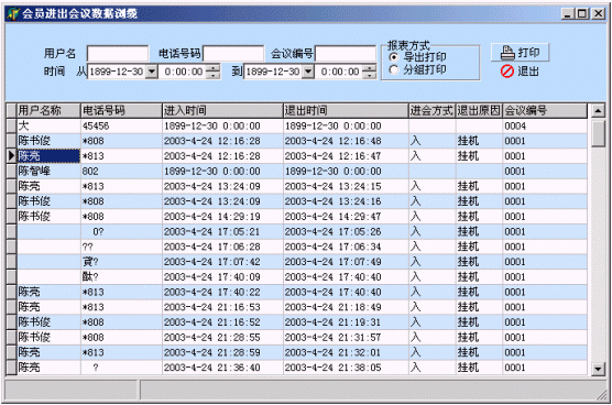 用戶接入:系統(tǒng)啟動(dòng)后,如果用戶電話呼入,則系統(tǒng)自動(dòng)接聽,并提請用戶輸入密碼校驗(yàn)后進(jìn)入會(huì)議系統(tǒng)。也可'集體撥號'、'單個(gè)撥號''點(diǎn)名'