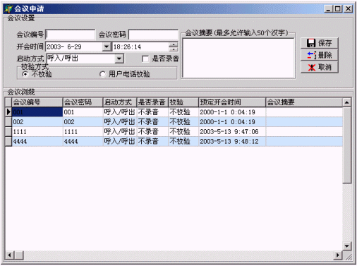 5. 校驗(yàn)方式有'不校驗(yàn)'和'用戶電話校驗(yàn)','不校驗(yàn)'是指所有電話撥打會(huì)議,系統(tǒng)都會(huì)接入;'用戶電話校驗(yàn)'是指撥入會(huì)議系統(tǒng)的電話號碼是系統(tǒng)會(huì)議成員的電話號碼,否則,系統(tǒng)不會(huì)接入。