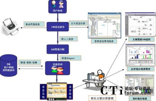 用戶電話呼入時(shí),系統(tǒng)通過自動(dòng)語音應(yīng)答的方式,實(shí)現(xiàn)用戶服務(wù)的自動(dòng)導(dǎo)航。交互式語音應(yīng)答功能自動(dòng)播放問候和語音提示信息,根據(jù)用戶按鍵選擇提供自助服務(wù)或者呼叫中心人工服務(wù)。呼叫中心提供人工服務(wù)后還可以為特定的用戶需求提供人工轉(zhuǎn)IVR自動(dòng)語音服務(wù),比如114查詢到電話、地址后,電信10000號(hào)呼叫中心提供的語音播放服務(wù)。