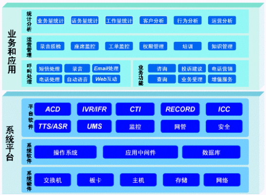 是呼叫中心的基礎,實現(xiàn)了具體服務電話的接入和處理,由硬件設備、系統(tǒng)軟件和平臺軟件構成。