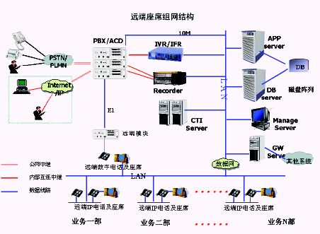 遠端座席組網方式中,中心點和遠端座席之間通過采用數(shù)字中繼(E1)連接的遠端模塊或采用數(shù)據(jù)網絡連接的IP電話方式。具體方式如下圖:
