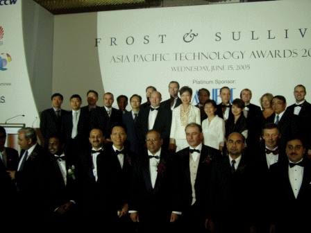 新加坡CommunicAsia2005展會(huì)期間,2005年6月15日晚—新加坡香格里拉飯店燈火輝煌,全球通信行業(yè)的精英公司濟(jì)濟(jì)一堂,共同見證了亞太地區(qū)一年一度的Frost & Sullivan亞太區(qū)技術(shù)大獎(jiǎng)的頒獎(jiǎng)禮的盛況。晚會(huì)期間共產(chǎn)生了6項(xiàng)運(yùn)營(yíng)商獎(jiǎng)項(xiàng)和11項(xiàng)供應(yīng)商獎(jiǎng)項(xiàng)。