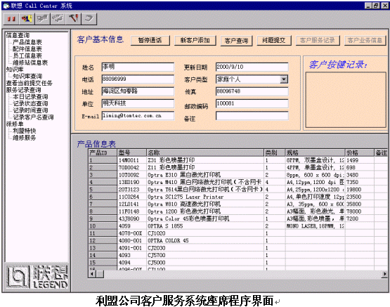 聯(lián)想神州數(shù)碼電子商務(wù)部于2000年7月承建利盟中國公司客戶服務(wù)中心系統(tǒng),該客戶服務(wù)系統(tǒng)可以為利盟全國的用戶提供產(chǎn)品、信息、價(jià)格、咨詢等服務(wù);服務(wù)方式包括人工、語音、傳真、郵件等。