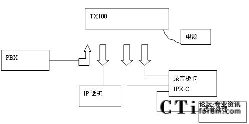 IP話機(jī)的錄音示意圖和圖1-4 E1/T1數(shù)字線錄音示意圖類似。不過(guò)此時(shí)PBX與IP話機(jī)之間的連線改成網(wǎng)線(RJ45)了。并且在兩個(gè)設(shè)備之間多了個(gè)并接設(shè)備TX100,其示意圖如下:
