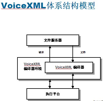 VoiceXML設(shè)計(jì)的工作原理:語音應(yīng)用程序作為系列頁存儲(chǔ)在類似于網(wǎng)絡(luò)服務(wù)器的文件服務(wù)器上。從實(shí)現(xiàn)平臺(tái)接收到輸入呼叫時(shí),VoiceXML編譯程序會(huì)向文件服務(wù)器發(fā)出一個(gè)特定URL請(qǐng)求,就像用戶瀏覽網(wǎng)絡(luò)時(shí)輸入網(wǎng)站地址一樣。文件服務(wù)器可以與編譯程序直接相連,也可以設(shè)置在外部,通過本地網(wǎng)或互聯(lián)網(wǎng)的IP協(xié)議訪問。他們可以保持應(yīng)用程序的服務(wù)邏輯,可以提供數(shù)據(jù)庫查找與其他系統(tǒng)操作功能。