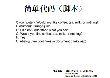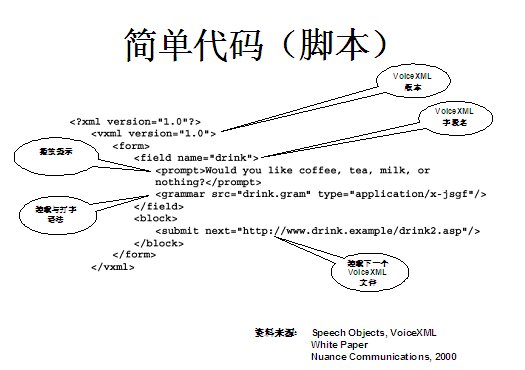世界上最古老的用戶界面--人類語言終于在二十一世紀(jì)借助于VoiceXML,一種語音可擴(kuò)展標(biāo)記語言發(fā)展成熟起來。作為世界上第一個(gè)真正的語音通信標(biāo)準(zhǔn),它定義了應(yīng)用開發(fā)商向用戶提供新型信息訪問服務(wù)的方式。通過這種服務(wù),用戶在任何地方,都可以通過電話或任何移動(dòng)設(shè)備,虛擬訪問任何信息。VoiceXML正在被廣泛應(yīng)用于旅游、金融與信息服務(wù)等行業(yè)的各種業(yè)務(wù)領(lǐng)域中,甚至是政府部門與市政機(jī)構(gòu),全球的無線運(yùn)營商等。
