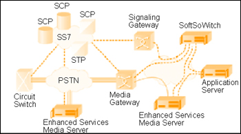 在PSTN網,交換機組、SCP(Service Connection Points)和媒體服務器協(xié)同工作,為用戶提供服務。在包交換網絡環(huán)境,這種服務由軟件交換機(Softswiches)、媒體服務器和應用服務器協(xié)同提供。連接這兩種網絡的橋梁是媒體網關和信令網關。值得注意的是,包交換中的部件都是邏輯點,其多個部件可能僅僅由網絡中的一個應用硬件平臺提供。例如:一個基于網絡提供語音識別功能的語音郵件系統(tǒng)可能包括如下模塊: