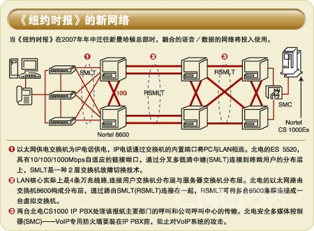 VoIP架構(gòu)是基于北電的通信服務(wù)器CS 1000平臺(tái),該平臺(tái)是一種基于服務(wù)器的IP PBX。CS 1000是基于北電的Meridian PBX特性集合,其主機(jī)運(yùn)行在一臺(tái)來自WindRiver系統(tǒng)公司的VxWorks實(shí)時(shí)操作系統(tǒng)的IP服務(wù)器上。一對冗余的CS1000將為新聞、廣告、發(fā)行和其他部門中大約3600 部IP電話以及部署在《紐約時(shí)報(bào)》的分類/顯示廣告呼叫中心的300部IP軟電話提供服務(wù)。CS 1000提供對34臺(tái)以上的媒體網(wǎng)關(guān)和18臺(tái)信令服務(wù)器(部署在網(wǎng)絡(luò)中為內(nèi)網(wǎng)連接的不同部門提供VoIP呼叫建立和信令的分布式專用設(shè)備)的集中管理。