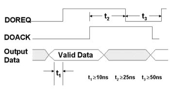 mode),相較于序列式的數(shù)據(jù)傳輸,并行傳輸提供了簡單且更高速的數(shù)據(jù)傳輸方式,不過其技術(shù)關(guān)鍵在于發(fā)送端與接收端之間的時(shí)序差問題,因此,針對(duì)此時(shí)序差的問題,高速數(shù)字I/O卡需提供握手模式,讓兩張卡以交握信號(hào)確保數(shù)據(jù)的正確性。下圖為數(shù)據(jù)輸出的時(shí)序圖: