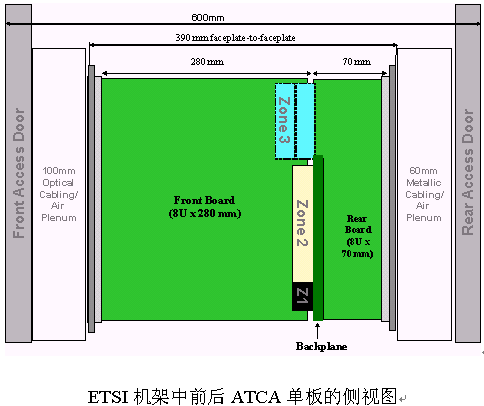 PICMG 3.0機(jī)構(gòu)要求主要來(lái)自于對(duì)600mm ETSI 和19" EIA標(biāo)準(zhǔn)機(jī)柜空間使用的研究。PICMG 3.0委員會(huì)在考慮單板尺寸能支持下一代元器件對(duì)物理和散熱的需求的同時(shí),機(jī)箱空間能和板子能達(dá)到最大限度的配合和利用。最初的工作是基于歐規(guī)卡的標(biāo)準(zhǔn),繼而又提升到支持低成本的片狀金屬架構(gòu)(簡(jiǎn)單電訊封裝)。對(duì)后走線模塊的支持滿足了對(duì)后I/O應(yīng)用的需求。在決定可以使用的單板空間時(shí),也充分考慮了前、后板的進(jìn)深范圍以供大量電纜束綁空間。經(jīng)過(guò)對(duì)不同規(guī)格尺寸的單板的優(yōu)點(diǎn)進(jìn)行討論之后,PICMG 3.0組織統(tǒng)一規(guī)格如下:前板 8U x 280mm,進(jìn)深1.2" pitch,選配后板8U x 70mm深;1.2" pitch,19" EIA機(jī)框可以支持14槽,而600mm ETSI的機(jī)框可以支持16槽。下圖所示為600mm ETSI機(jī)架中的ACTA前后單板的側(cè)視圖: