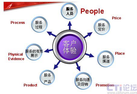 下面這張圖是服務(wù)營銷的7P模型,在這里我認為最應(yīng)該關(guān)注的是People——人。這里,我想引用世界經(jīng)理人刊登的一篇文章“影響中國的十大管理理念”上的一段文字:“邁向服務(wù)型經(jīng)濟實際上就是邁向人才經(jīng)濟。在制造業(yè)中,價值是由機器創(chuàng)造的。在服務(wù)業(yè)中,價值則是人創(chuàng)造的!边@也是在服務(wù)業(yè)中,要將“人”進行體現(xiàn)。也許你不在乎為你制造產(chǎn)品的工人長的美或丑,但為客戶服務(wù)的人員如果長的很丑,對服務(wù)就會有一定的影響。大家只看產(chǎn)品結(jié)果,不關(guān)注過程,但是服務(wù)卻是與過程緊密的結(jié)合。