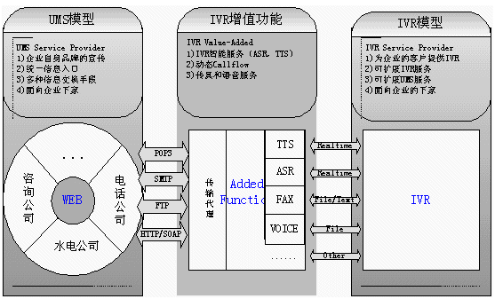。ǘ㊣VR系統(tǒng)的傳統(tǒng)缺點(diǎn)是缺乏智能化,流程更改困難,播放的語音或者內(nèi)容必須預(yù)先錄制.所以我們提供UMS服務(wù),增強(qiáng)IVR的功能. 使我們的IVR功能增強(qiáng)(Ext-IVR Service Provider)