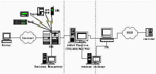 傳統(tǒng)UMS的分散的網(wǎng)民,而IVR, UMS服務(wù)提供商的客戶是企業(yè),系統(tǒng)的使用者則是企業(yè)的客戶(即系統(tǒng)面向下家,由下家為最終客戶提供服務(wù)),分離的模式可以有兩個(gè)獨(dú)立的企業(yè)來運(yùn)營系統(tǒng),IVR Service由具有電信資源的企業(yè)(如:具有接入號(hào),有電信中繼資源,還有CTI系統(tǒng)建設(shè)經(jīng)驗(yàn))運(yùn)營。UMS Service由ISP企業(yè),網(wǎng)站門戶企業(yè)等在互聯(lián)網(wǎng)絡(luò)有建設(shè)經(jīng)驗(yàn)的企業(yè)運(yùn)營。兩家企業(yè)密切合作。共同提供完善的統(tǒng)一的信息服務(wù)。