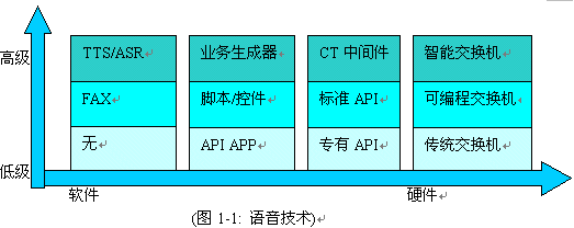 語言產(chǎn)品線可以用如下(圖1-1)一條技術(shù)柱心表示, 在每一個技術(shù)層面上, 國內(nèi)通信企業(yè)都有相應的產(chǎn)品, 不同技術(shù)層面技術(shù)組合,成為一系列列產(chǎn)品解決方案.