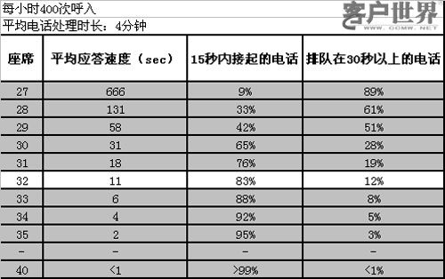 然而,圖3從客戶感受的角度來分析問題。從客戶的角度來看,客戶聯(lián)絡(luò)中心提供的服務(wù)并沒有達(dá)到他們期望。對(duì)于每個(gè)來電者最首要的問題是要求在幾秒鐘內(nèi)接通電話。如果所有的座席都忙碌,這種可能性就會(huì)大大降低了。如果在線座席代表數(shù)量不足,則平均排隊(duì)時(shí)間就會(huì)增加,這將導(dǎo)致客戶的不滿,進(jìn)而將他們的業(yè)務(wù)轉(zhuǎn)向別處。