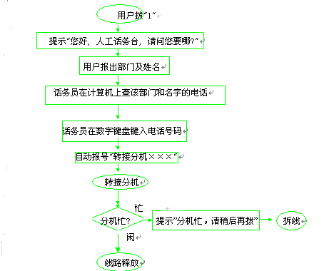 整個人工查號轉(zhuǎn)接過程中, 話務(wù)員不需要說話, 系統(tǒng)在所有必要之處都有提示音, 話務(wù)員只要在數(shù)字鍵盤上鍵入部門號"0××"和電話號碼"2××"。