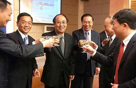 國務(wù)院新聞辦主任趙啟正(中)等領(lǐng)導(dǎo)慶祝下一代通信網(wǎng)絡(luò)的開通