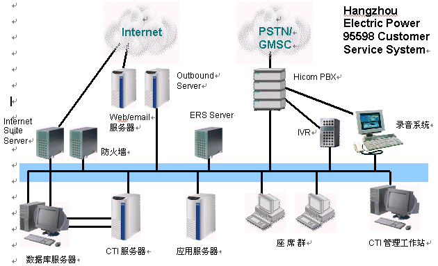 西門(mén)子Hicom 350E,作為杭州電力"95598"客服系統(tǒng)的通信服務(wù)器,以其出色的品質(zhì)和強(qiáng)大的功能保證了整個(gè)系統(tǒng)的正常運(yùn)行。同時(shí)充分利用杭州電力局原有的通訊線路,創(chuàng)新性的在原有的SDH(同步數(shù)字體系)網(wǎng)絡(luò)上利用HiPath HG 3200遠(yuǎn)端模塊,將中心的人工坐席延伸到了五個(gè)郊縣電力公司,真正解決了全市統(tǒng)一接入,一個(gè)號(hào)碼對(duì)外,業(yè)務(wù)本地受理的問(wèn)題;同時(shí)遠(yuǎn)端坐席的工作方式真正做到和中心完全一致,給使用、管理、培訓(xùn)等帶來(lái)極大的便利。