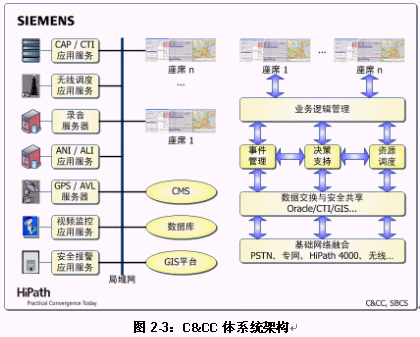 C&CC是西門子指揮控制中心全面解決方案的核心。C&CC以有線(HiPath 4000)/無線(模擬和數(shù)字集群)通訊平臺為信息采集和資源調(diào)度基礎,系統(tǒng)核心模塊包括:融合多種業(yè)務的接處警工作流,面向地理信息對象的資源管理,面向事件的案情與錄音管理,基于預案的輔助決策支持,以及多種統(tǒng)計、查詢和報表生成工具等。在此基礎上,C&CC還提供豐富的接口,確保與技防報警、圖像/視頻監(jiān)控和GPS