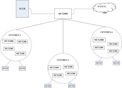 MCX2000支持連接多個(gè)屬于不同企業(yè)的MCX200/1000,能夠把同一個(gè)企業(yè)的不同MCX200/1000集中組成IP CENTREX群,支持群內(nèi)呼叫、群外呼入、群外呼出等功能,使用戶(hù)感覺(jué)不到多個(gè)MCX200的存在,如同所有的用戶(hù)在同一個(gè)交換設(shè)備內(nèi)。MCX2000同時(shí)支持多個(gè)IP CENTREX群?梢杂脕(lái)構(gòu)建大型企業(yè)的廣域VOIP網(wǎng)絡(luò),或作為NGN的大客戶(hù)接入網(wǎng)絡(luò)。如下圖所示: