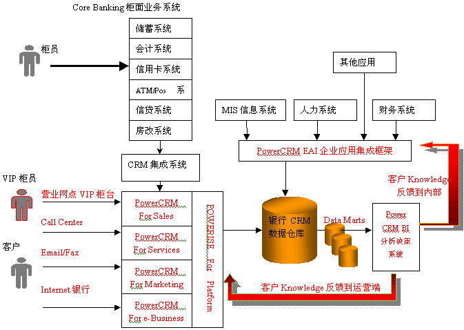 利用PowerCRM的銀行分析型CRM解決方案,對(duì)客戶信息進(jìn)行全面的分析,從而挖掘出許多客戶知識(shí),繼而制定和改進(jìn)相應(yīng)的市場(chǎng)策略,應(yīng)用于PowerCRM運(yùn)營(yíng)型CRM系統(tǒng)中,更好地指導(dǎo)營(yíng)銷人員為客戶服務(wù)和完善客戶服務(wù)流程;同時(shí)也需要反饋到銀行內(nèi)部系統(tǒng),用于增強(qiáng)銀行內(nèi)部的運(yùn)營(yíng)效率。