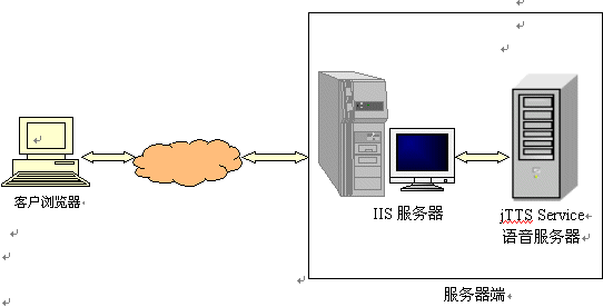 語音服務器方案是指利用捷通華聲在CTI領域成熟應用的jTTS Service語音服務器,增加一臺或多臺語音服務器到現(xiàn)有的IIS服務系統(tǒng)的網(wǎng)絡環(huán)境中;在IIS服務器中,增加訪問語音服務器的功能。當IIS服務器需要流媒體輸出時,向語音服務器發(fā)出請求,語音服務器接受IIS服務器的請求,并對請求的數(shù)據(jù)進行合成、格式轉換,得到流媒體后返回給IIS服務器,IIS服務器再將此流媒體傳輸給用戶。