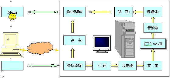 瀏覽器端(Explorer)發(fā)出瀏覽請求,網(wǎng)站服務器(IIS)根據(jù)請求查找流媒體(音頻流)文件,如有,則將流媒體返回客戶端,并啟動客戶端的MS media player播放流媒體。若沒有,則向語音服務器(jTTS Service)發(fā)出合成請求,并將所需合成的文本通過Socket接口傳送至語音服務器;語音服務器響應網(wǎng)站服務器的合成請求后,將調用jTTS合成技術進行語音合成,并調用WMF SDK將生成的音頻文件轉換成流媒體格式ASF;通過Socket接口返回IIS服務器端后,將此流媒體文件存儲到指定的Web目錄,同時將流媒體返回瀏覽器端,啟動MS media player播放。其流程如下: